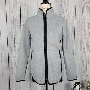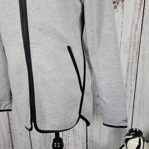 Item: The North Face Marled Grey Lightweight Clean Beauty Casual Zip Up Jacket. Very sharp look with the black piping to contrast! Material is soft, pliable and high quality.