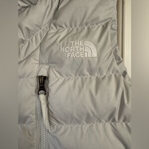 The Northface Niche hooded vest, down puffer vest, zip up, puffy vest. Light silver grey. Slightly diagonal zip up design, size small. In excellent pre-owned condition.