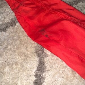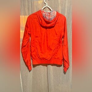 Bright red lightweight windbreaker with hood and zippered pockets. Durable and stylish for outdoor activities.