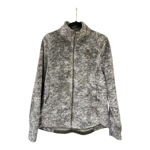 Excellent pre-owned condition, this jacket adds warmth without weight. Made of 100% polyester, full zip front, long sleeves with thumb holes, and two zippered pockets in front. Marled grey, size large, machine wash, rounded (longer) hem in back. Zippers work smoothly, stitching intact.