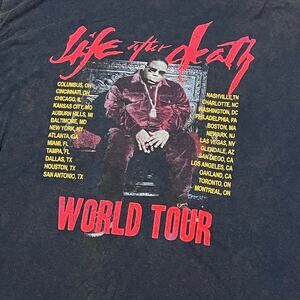 Introducing The Notorious B.I.G. Life After Death World Tour T-Shirt in men's large, featuring double-sided graphics. Made from 100% cotton, the design commemorates the world tour concept honoring Christopher Wallace, also known as Biggie Smalls, a pivotal figure in East Coast hip hop. Shirt is used in great condition.