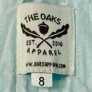 Sweet and classic aqua dress from The Oaks Apparel, size 8. Made in a lightweight linen (iron got the tag one time), with a ruffled neckline and an oversized bow in the back. Flowy A-line shape, sleeveless, and perfect for warm-weather occasions.