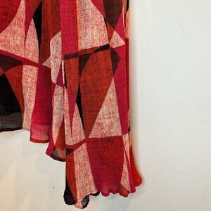 Anthropologies, The Odells Nicole Trumpet Sleeve Mock Neck Blouse. Red geometric pattern Polyester, Crepe feeling, Ruffle Sleeve, button back with key hole, hand wash, imported. Smocked mock neck. Super stretchy. Good condition, no flaws!