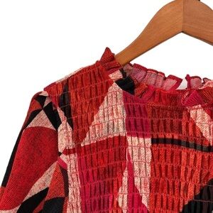Classic and elegant, the Marcia Dress features our fan favorite smocked bodice, relaxed short sleeve flutter sleeves, printed waist tie detail and a rear neck keyhole closure, all featured in our custom geo print with hues of red, pink, pastel and black throughout.