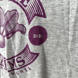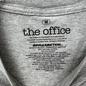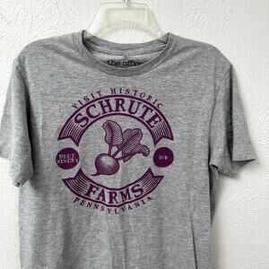 This is a great T-shirt for fans of the NBC TV Show "The Office." This shirt is perfect for fans of Dwight Schrute. The shirt says Schrute Farms. It has the Schrute Farms logo in purple against a gray short sleeve T-shirt.