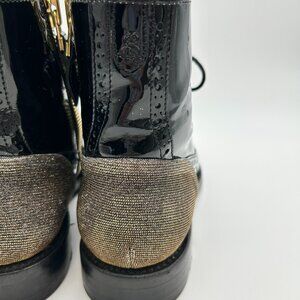 The Office of Angela Scott black patent leather Harrison boots. Made in Portugal. Lace up, gold side zipper and gold accent covering the heels.