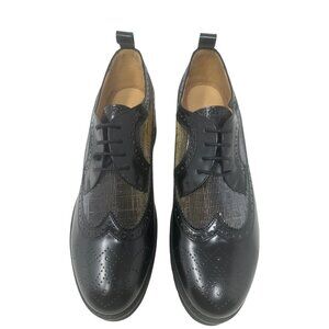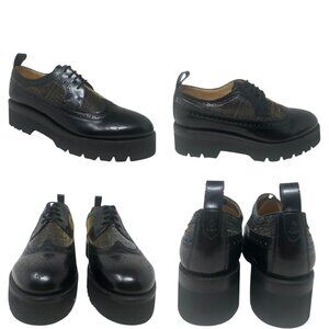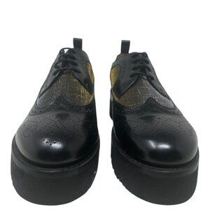 These platform oxfords are a chic blend of classic and modern style, featuring black leather with gold metallic mesh for a sophisticated, edgy look. They boast an avant garde design, timeless elegance with wingtip details, and an urban sophistication perfect for city life.