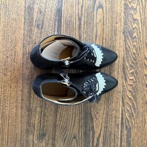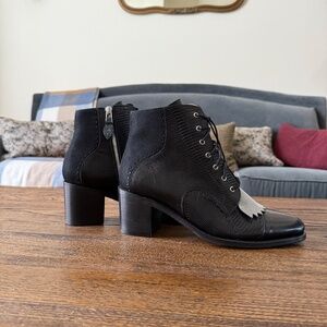 The Office of Angela Scott. Black size 42. Oxford style boots. 3 inch heels. Sparkly silver removable fringe. Textured leather with smooth leather toe. Silver zipper and black laces. Never worn with stuffing still inside. No box. See pictures.