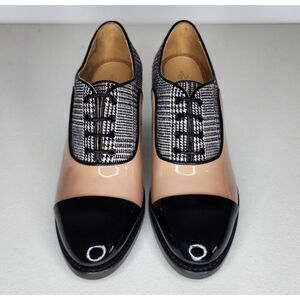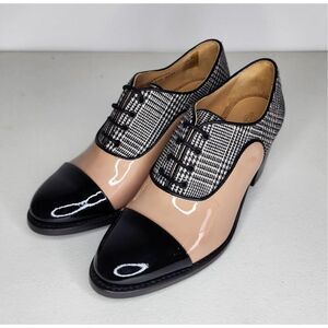 The Office of Angela Scott Miss Maisel Midheel in nude/ patent/ glenplaid combination. This color way is no longer available. Excellent condition. A few small marks as shown in photos. A perfect neutral shoe with a little edge. Perfect with jeans, a dress or a suit.