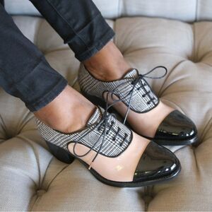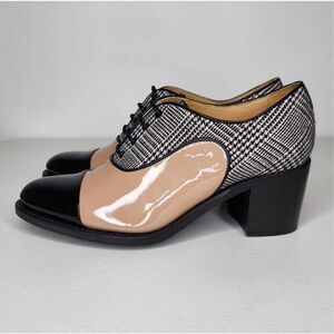 The Office of Angela Scott Mrs Maisel Midheel size 37.5 nude glen plaid leather
