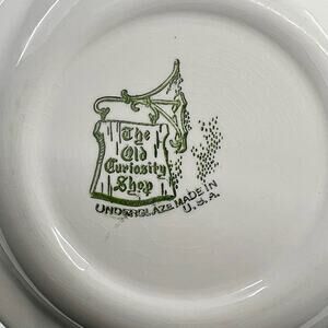 The "The Old Curiosity Shop" set of 3 vintage soup bowls by Royal China features a round shape with a green ceramic material. The soup bowls measure 8.25 inches in diameter and were produced in the United States during the 1950s. These bowls are part of a pressed glass production style, using a fused glass technique, and are adorned with a printed backstamp of the brand.