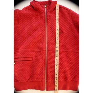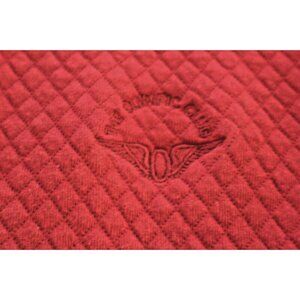 The Olympic Club San Francisco Quilted Logo Jacket in size small is a classic and preppy outerwear piece made from cotton canvas with a stand-up collar and full zip closure. The jacket features a solid red color with a quilted design and embroidered logo accents, making it a stylish choice for casual or travel occasions during the winter, fall, or spring seasons. With a mid-length design, chest size of 38 inches, and regular fit, this jacket is perfect for various activities such as gym training, track and field, tennis, walking, golf, soccer, cross training, and running. Made in the United States by Straight Down, this vintage-inspired jacket is a timeless addition to any man's wardrobe.