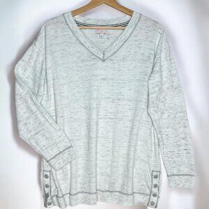 This sweater from The Oprah Magazine Collection by Talbots offers a beautifully crafted design with its soft fabric and relaxed fit. The gentle gray and white hues combined with the V-neck cut provide an elegant yet versatile aesthetic. The long sleeves and button detailing along the sides add a unique touch, perfect for a refined look.