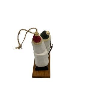 Features cute snowman couple riding a s'mores sled. Arms look to be made of wire. Made of resin.
