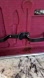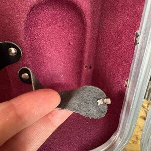 One shot glass strap is detached from the felt. All snaps & clasps work and the key to lock the case is included.