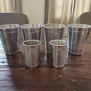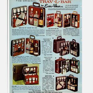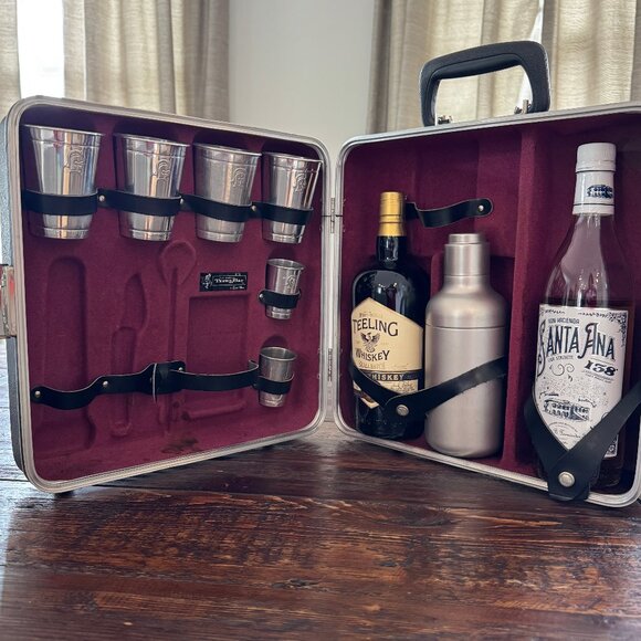 The Original Trav-L-Bar by Ever-Wear Executair737. The perfect gift for the person who has everything or a fab presentation for that special gift bottle! The ultimate conversation starter as well as a practical case to transport your favorite spirits to your party on the go. The Original Trav-L-Bar by Ever-Wear was the ultimate accessory during the golden age of air travel...Hop on the plane with this baby and you were the most popular guest in the cabin! While in today's world this case loaded with liquor doesn't fly, it would be marvelous addition on a long train ride or at your next picnic, tailgate or beach party. The set has 4 8oz aluminum cups & 2 2oz aluminum shot glasses. There is space for a cocktail spoon, tongs and a corkscrew/bottle opener (not included). In addition there is an additional slot for a flask, napkins or deck of cards! 3 bottles of spirits, mixers or a cocktail shaker can fit easily on the opposite side (not included).
