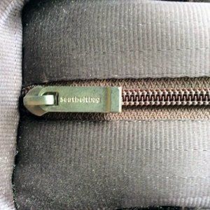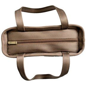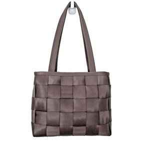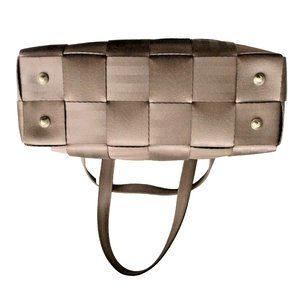 This is a beautiful bag in perfect condition inside and out. It is made from woven seatbelts that are a rich metallic brown. The bag zips closed at the top and has 4 metal feet. Inside are 2 pockets - 1 has a zipper. The approximate measurements are: