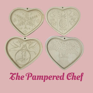 Add some charm to your baking with this set of four ceramic cookie molds from The Pampered Chef Family Heritage collection. These molds come in a heart shape and a beige color, with a 5-inch diameter for each mold. They are suitable for use in both electric and gas ovens and feature easy-clean surfaces for hassle-free baking and cleaning.