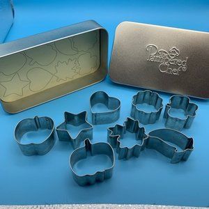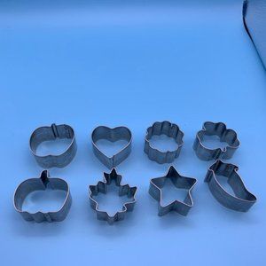 8pc mini cookie cutter set with storage tin. Set included storage map. Star, heart, leaf, clover, flower, pepper, pumpkin, and apple shape cookie cutters.