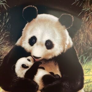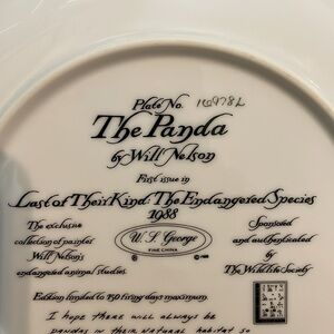 The Panda Will Nelson Vintage Last of Their Kind: The Endangered Species Plate 1988. First issue in series. Limited edition art painted plate. Gold edged. “I hope there will always be pandas in their natural habitat so others can study them in China like I have.” Sponsored and authenticated by The Wildlife Society. Very good preowned condition. May be slight discoloration on area that sits on table. These are not plates to eat off of, artwork only.