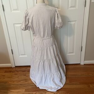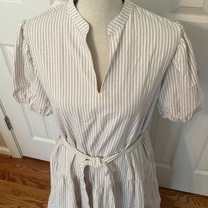 The Pants Store Midi Dress Taupe White Striped Tie Belt Size Large Short Sleeve