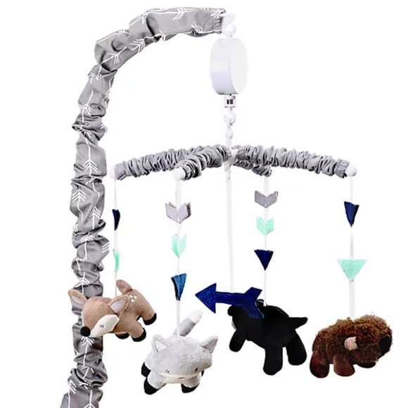 Rotating mobile displays cute hanging forest animals and colored arrow accents