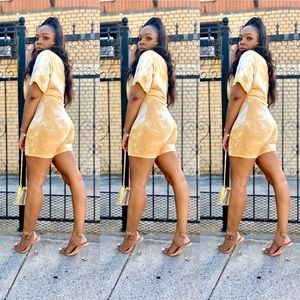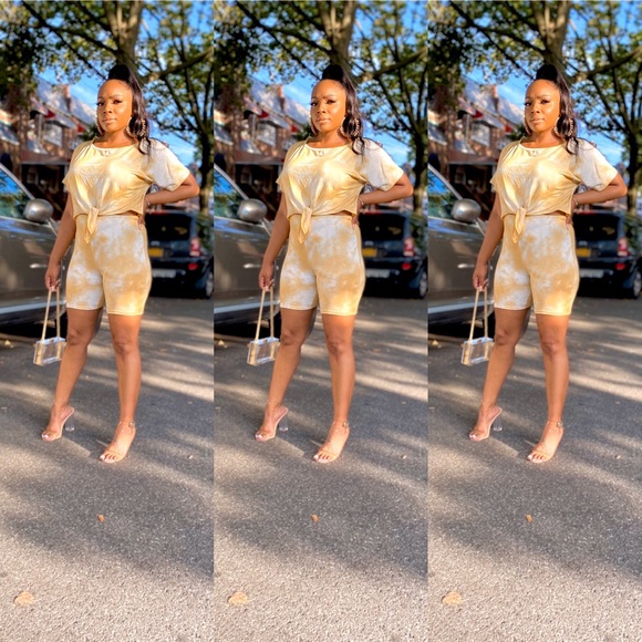 This Two piece set Short sleeve top and biker shorts has good stretch. It's 95% Polyester 5% Spandex. Please Hand wash cold water only.