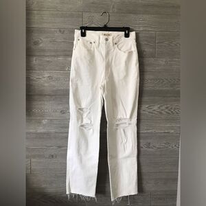 The Petite Perfect Vintage Straight Jean in Tile White: Ripped-Knee Edition size 27 inseam 28.25” great condition distressed knee and raw hem