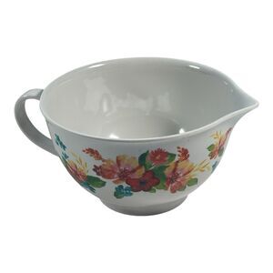 This charming mixing bowl from The Pioneer Woman's Spring Bouquet collection features a beautiful floral design on a white melamine background. It includes a convenient handle and pouring spout, making it perfect for all your baking and cooking needs. Add a touch of Ree Drummond's signature style to your kitchen!