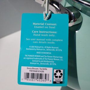 The Pioneer Woman Breezy Blossom Enamel On Steel 1.9-Quart Tea Kettle - the perfect statement piece for your stove or buffet display. Constructed with enamel on steel, this durable and versatile kettle heats quickly and evenly, making it the ideal vessel for your favorite hot beverage. Its charming handle folds down for easy filling and safer lifting, while its vintage belly-shape body and elegant curved spout add a touch of flair to your modern farmhouse kitchen. The enamel finish resists discoloration and stains, ensuring that this kettle remains vibrant for pot after pot of tea (FLAW: missing nickel-sized interior enamal spot in pot and on lid). Mix and match with other pieces in Ree's collection to create eye-catching arrangements in any room. As a NY Times Best Selling Author, TV personality, and social media phenom, Ree Drummond - the woman behind the popular Pioneer Woman lifestyle blog - knows a thing or two about cooking and entertaining. Start sipping in style with The Pioneer Woman Breezy Blossom Enamel On Steel 1.9-Quart Tea Kettle today.