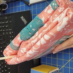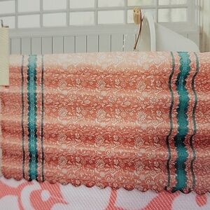 Coral shower curtain with teal crochet trim. Reinforced buttonhole top for durability.
