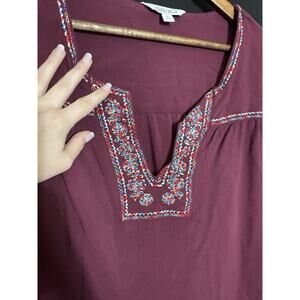 Discover the elegance of The Pioneer Woman Split Neck Embroidered Blouse, designed for those who appreciate a blend of boho charm and classic style. This women's plus size 2X blouse boasts a rich burgundy hue that sets the stage for its intricate embroidered accents, featuring a peasant-inspired theme that adds a touch of rustic beauty. Crafted with comfort in mind, the blouse is made from soft, breathable rayon and offers a relaxed fit with 3/4 casual sleeves. The round neckline and pullover closure ensure an easy and flattering fit for any occasion. Practical and stylish, this tunic-style top is machine washable, making it an essential addition to your wardrobe for easy care and timeless style.