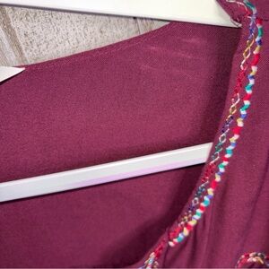 Brand New With Tags! Color is Burgundy color. Has embroidery pattern on the shirt. Around neck line with the split in the middle. 3/4 sleeve length. Armpit to pit is about 28.5 inches. Length from shoulder is about 30 inches. 100% rayon. Has had 1 little flaw inside shirt, but nothing on outside