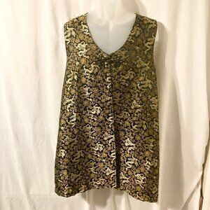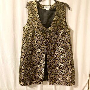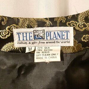 The Planet brand. Size men's medium. Elevate your wardrobe with this stunning Chinese vest , featuring exquisite golden dragon embroidery throughout and a single frog closure / decorative toggle. The deep V-neck and sleeveless design create an elegant and timeless look, perfect for special occasions or cultural events. The intricate dragon embroidery symbolizes strength and power, making it a statement piece that’s both bold and sophisticated. Made of 22% silk, 78% rayon. From a pet friendly home.