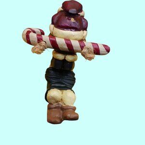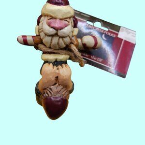 This intricately designed ornament by The Plum Creek Folks features a playful elf hanging from a candy cane. A unique addition to holiday decor, showcasing craftsmanship and festive charm.brand new from smoke and pet free home