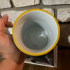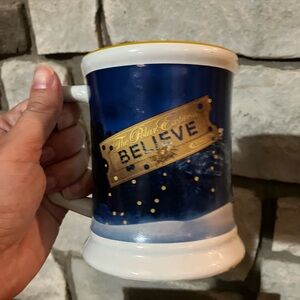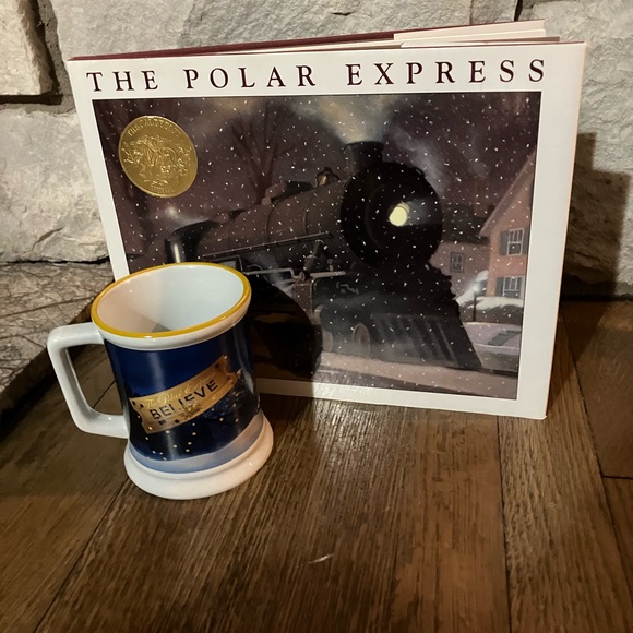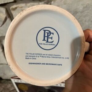 The Polar Express mug with a white base. Features a blue logo. Dishwasher and microwave safe. Both are pre loved with light signs of wear. The mug does have a small chip on the bottom edge. It’s not noticeable, see pictures.