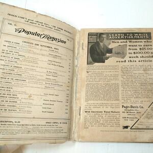 The Popular Magazine September 1905 Commander McTurk Cover. Has missing pages at the end and is missing the back cover as well. Pages 1-128 are in tact, pages 129 and on are torn in half. The magazine has foxing on the pages and the cover is stained. The pages still turn and all the words can be read up until page 128 where the rest of the pages are missing. The spine has tape. Please see pictures. Reasonable offers are considered. Check out my store for vintage and antique collectibles. Message me if you have questions.