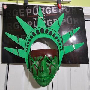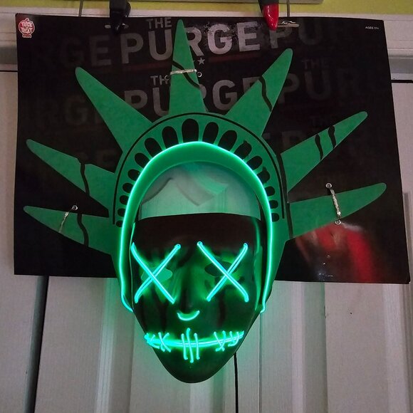 This amazing mask is a perfect version of the iconic mask worn the Lady Liberty Purger in The Purge: Election Year. Each mask comes with stitched Green LED Lights, a sturdy foam crown and AA battery pack with three flashing modes that can easily clip on to your pants or pocket. (Batteries Not Included).