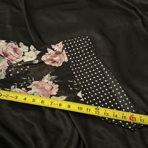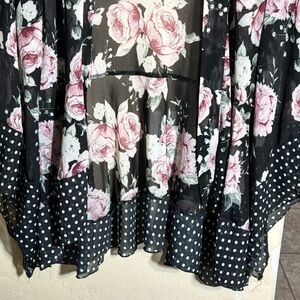 The Pyramid Collection cardigan, Black sheer cardigan, Open-front cardigan, Floral print cardigan, Floral/black white polka dot print design, Polyester spandex blend, Stylish layering piece, Lightweight sheer fabric, Trendy open-front design