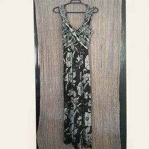 Discontinued style, no longer available on Pyramid Collection site. The perfect warm weather maxi dress! Features a light blue and navy all over floral pattern, crossover detail empire-waist front, wide straps, and tie back for a beautifully flattering fit! Flowy fabric is 92% Rayon, 8% Spandex. Generously sized medium.