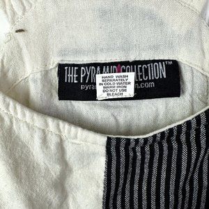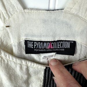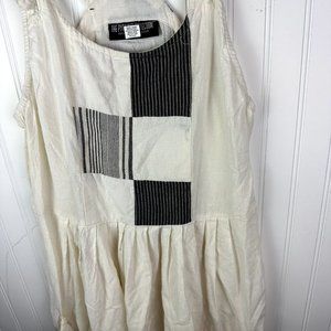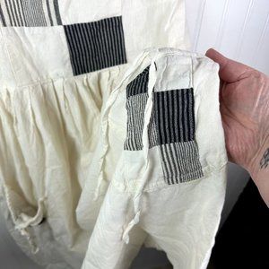 Patch Perfect. Handcrafted with playful style and a vintage vibe, this breezy jumper delights with its natural charm. Overall-style bib is adorned with black pinstripe patches. Knotted shoulder straps let you adjust the length. Patch pockets are accented with patches and ruched with drawstring bows. 100% woven cotton.