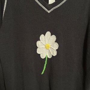 Great condition. Size M. 109% cotton. Black with white stitching around bottom, cuffs, neck and shoulders. One white flower on front. Great with leggings, jeans or dress pants. So cute. pit to pit 23 and 30 inches long.