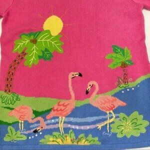 The Quacker Factory Pink Flamingo Embroidered Short Sleeve Sweater Sz Med Tropic