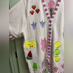 EUC! Super cute pink and striped sweater cardigan w/ embroidered fruit, ice cream, swimsuits, and other accessories. Pearl details.