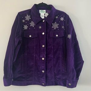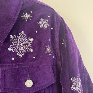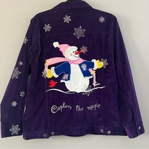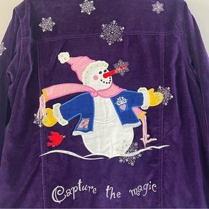 The Quacker Factory Purple Holiday Jacket. Snowman and snowflake details with Capture The Magic embroidered on back. Hand wash cold, hang dry. Very nice condition. Button closure. Appx. measurements with garment laying flat: