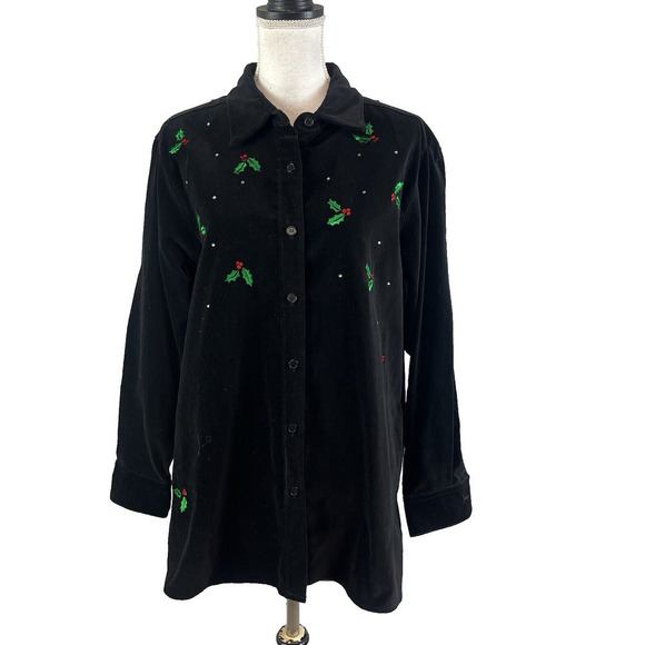 The Quacker Factory Shacket Jacket size Large Black Velvet Candy Canes Christmas