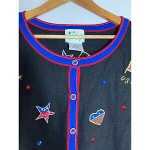 The Quacker Factory USA Patriotic Womens 2XL Black Button Cardigan Sweater Beads