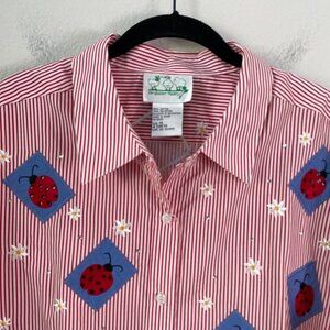 The Quacker Factory Womens Plus 1X Striped Ladybug Print Button Up Shirt Top