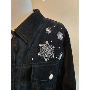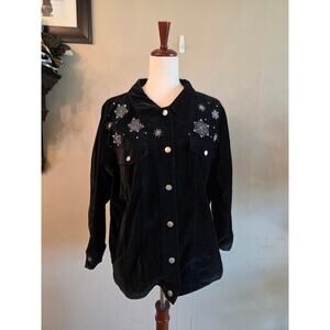 The Quacker Factory Women's Black Velvet Jacket. Beading, Embroidery, and Applique. 100% Cotton. In Excellent Preowned Condition. Smoke Free Home.
