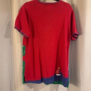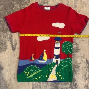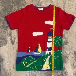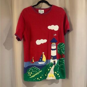 This Quacker Factory tee showcases a vibrant coastal scene with a playful lighthouse design on a bright red background. Crafted from quality materials, it features short sleeves and a classic crew neck, making it a perfect casual choice for any day. The bold colors and whimsical artwork add a touch of fun to your wardrobe.